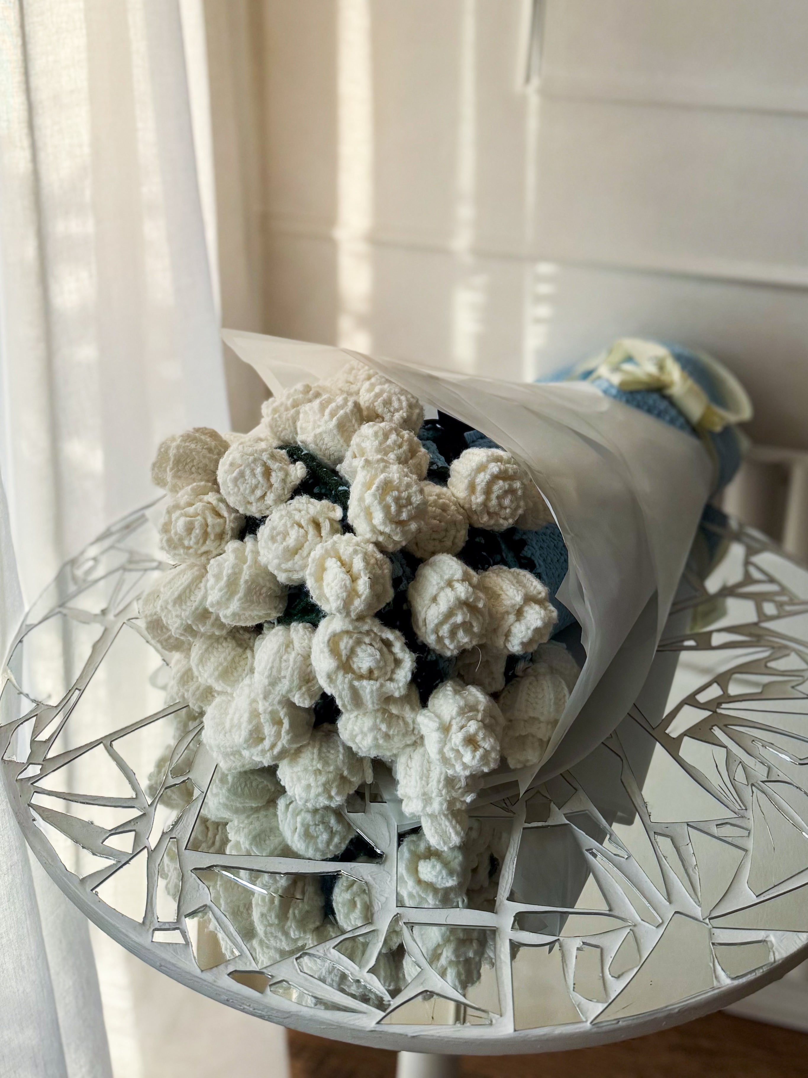 Our unique dual-craft process combines expert hand-knitting with delicate hand-rolled flower artistry.